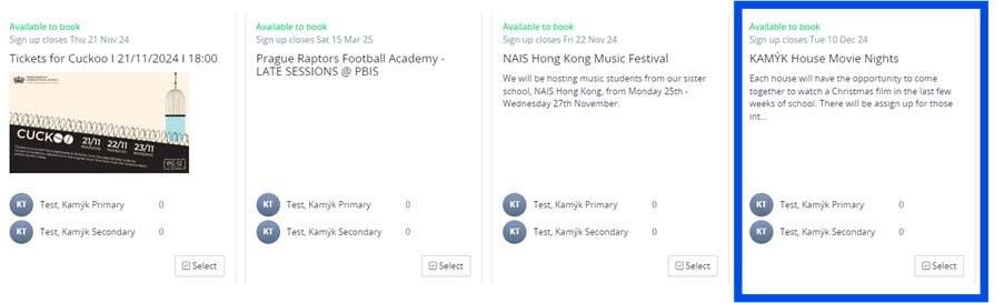 To register your child, go to the "Activities & Clubs" section, select "KAMÝK House Movie Nights" from the available registrations (as shown below).