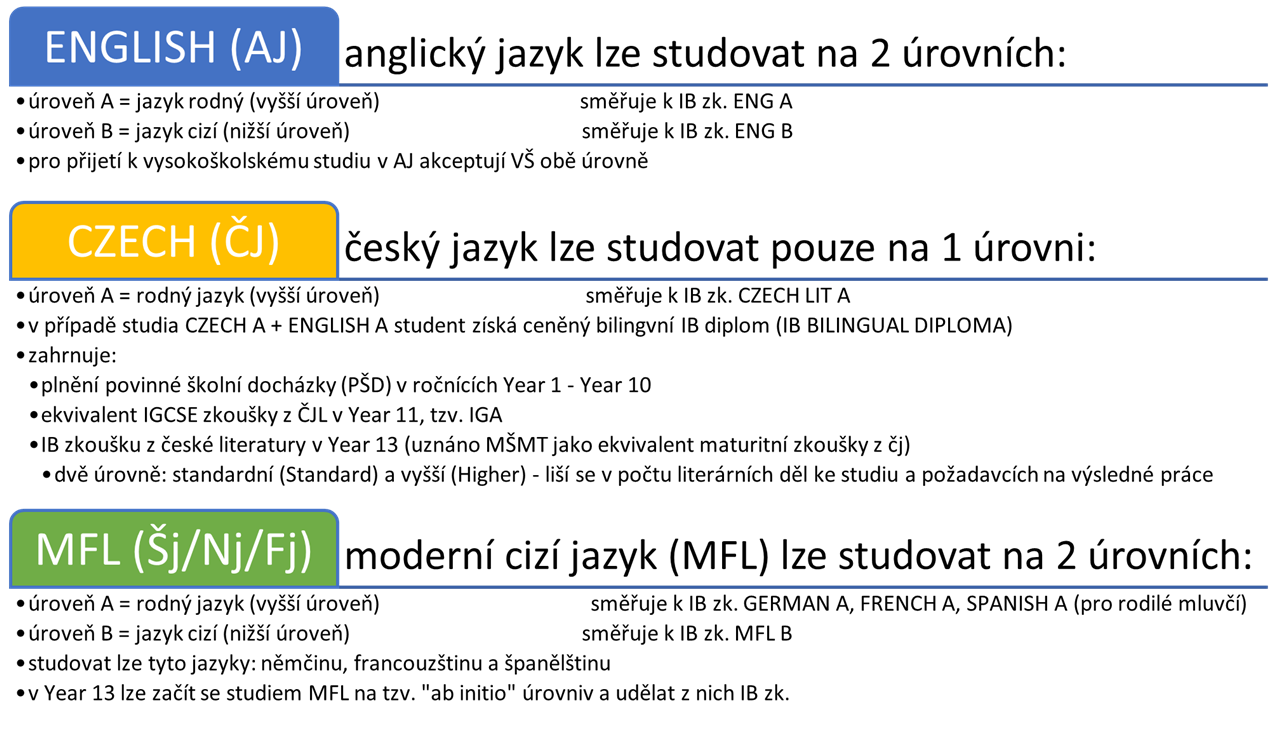 Pro žáky české národnosti nebo žáky plynně hovořící česky jsou těmito jazyky čeština (Language A) a angličtina (Language B/ Language A*).
