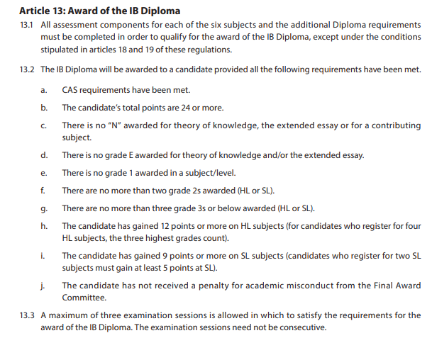 Aby student složil mezinárodní maturitu, která je uznávaná ve světě i v ČR, je zapotřebí, aby dosáhl min. 24 bodů a splnil všechny ostatní požadavky IB (viz tabulka níže):